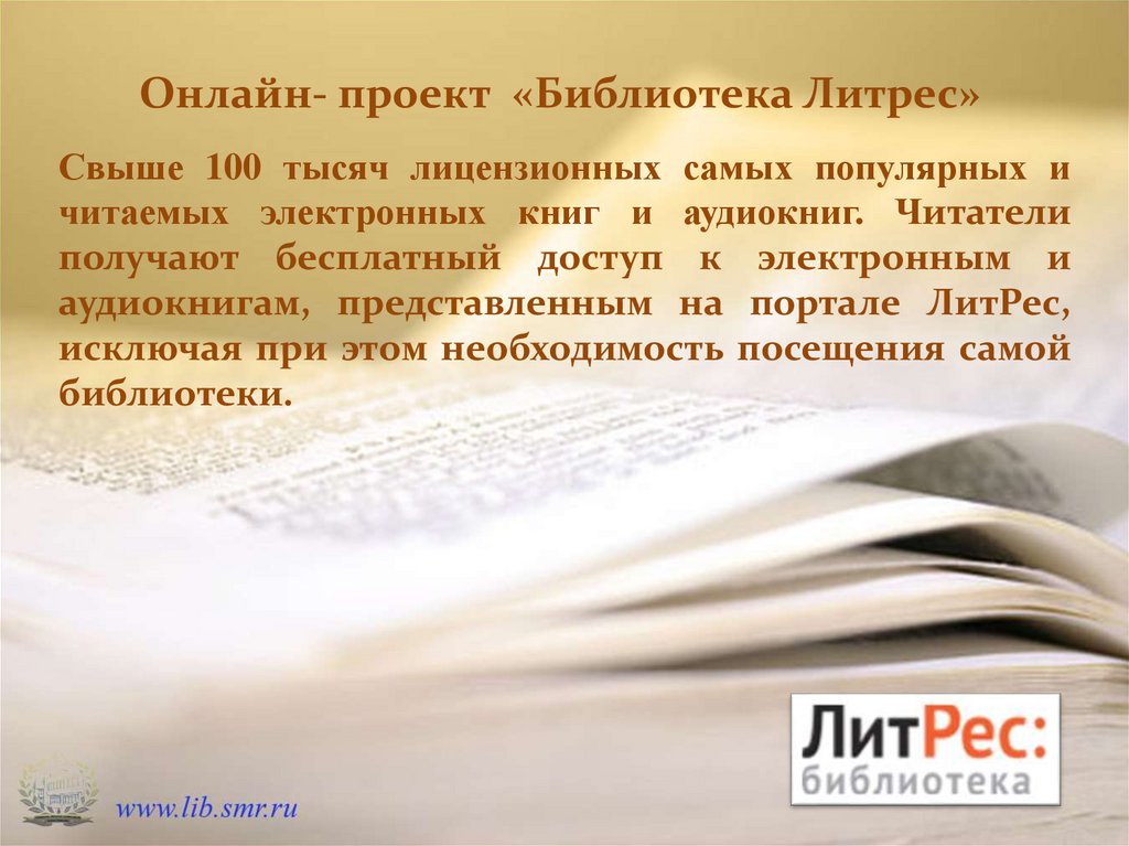 Онлайн- проект «Библиотека Литрес»Свыше 100 тысяч лицензионных самых популярных и