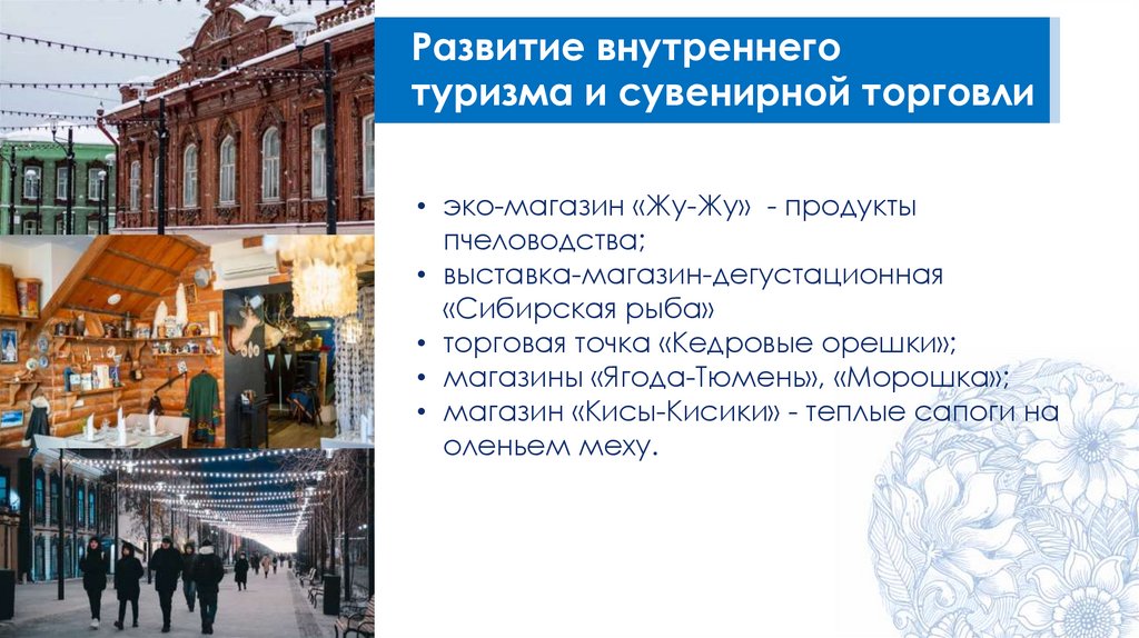• развитие внутреннего туризма( Галерея Затюменки, Сибирский сувенир,