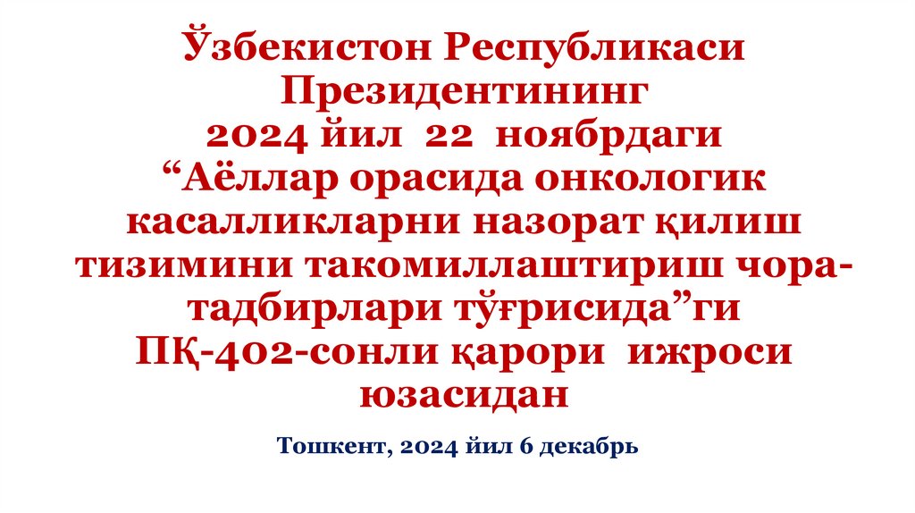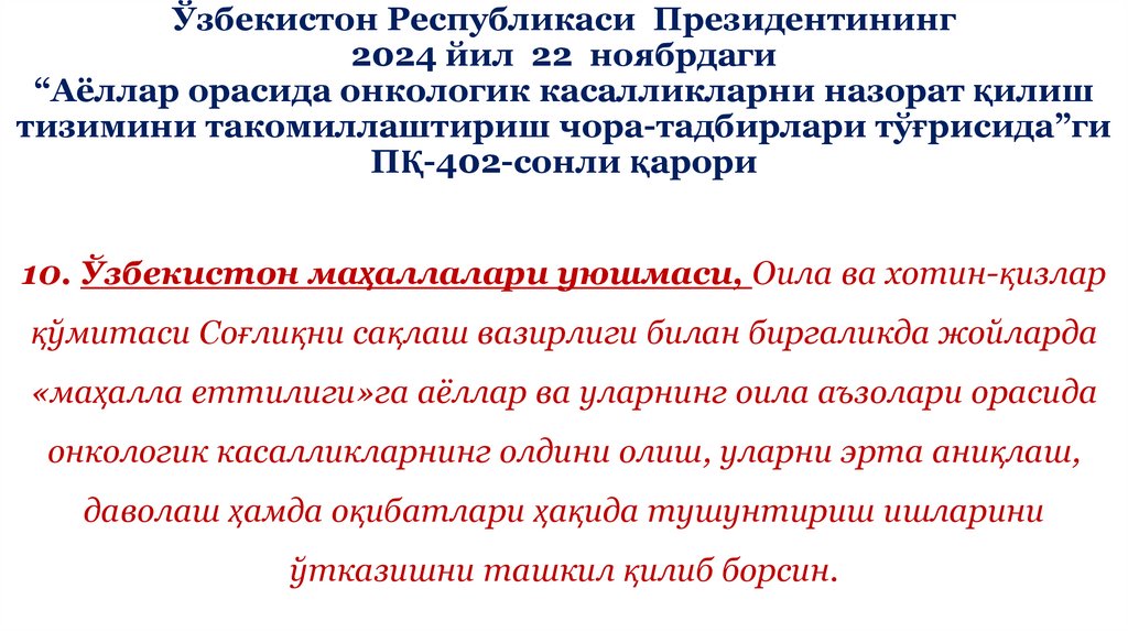 Аёллар орасида онкологик касалликларни назорат қилиш тизимини такомиллаштириш чоратадбирлари тўғрисида