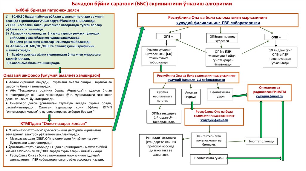 Бачадон бўйни саратони (ББС) скринингини ўтказиш алгоритмиТиббий бригада патронаж дояси