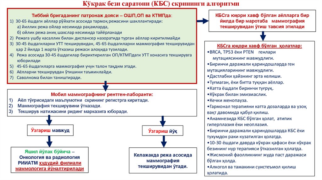 Кўкрак бези саратони (КБС) скрининги алгоритмиТиббий бригаданинг патронаж дояси – ОШП,ОП ва КТМПда: