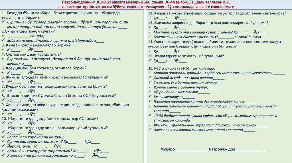 Патронаж доянинг 30,40,50 ёшдаги аёлларни ББС ҳамда 30-44 ва 45-65 ёшдаги аёлларни КБСкасалликлари профилактикаси бўйича скрининг текширувига йўналтиришдан аввалги саволномаси.