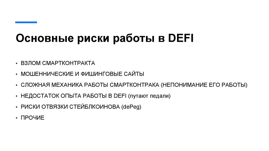 Основные риски работы в DEFI• ВЗЛОМ СМАРТКОНТРАКТА