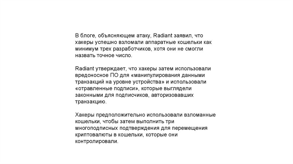 В блоге, объясняющем атаку, Radiant заявил, чтохакеры успешно взломали аппаратные кошельки как