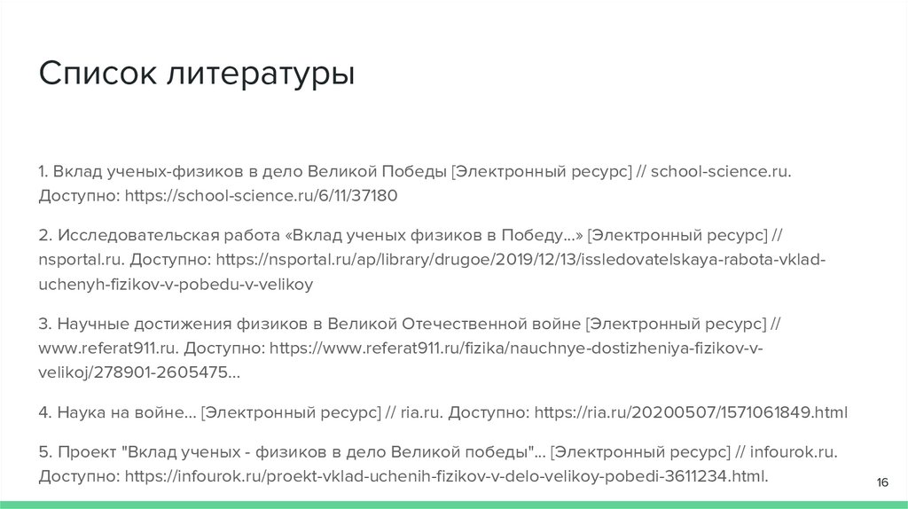 Список литературы1. Вклад ученых-физиков в дело Великой Победы [Электронный ресурс] // school-science.ru.