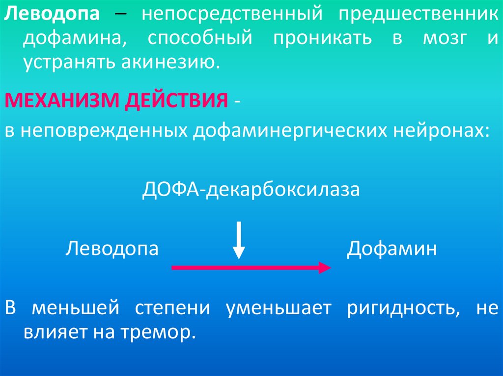 Леводопа – непосредственный предшественникдофамина, способный проникать в мозг и