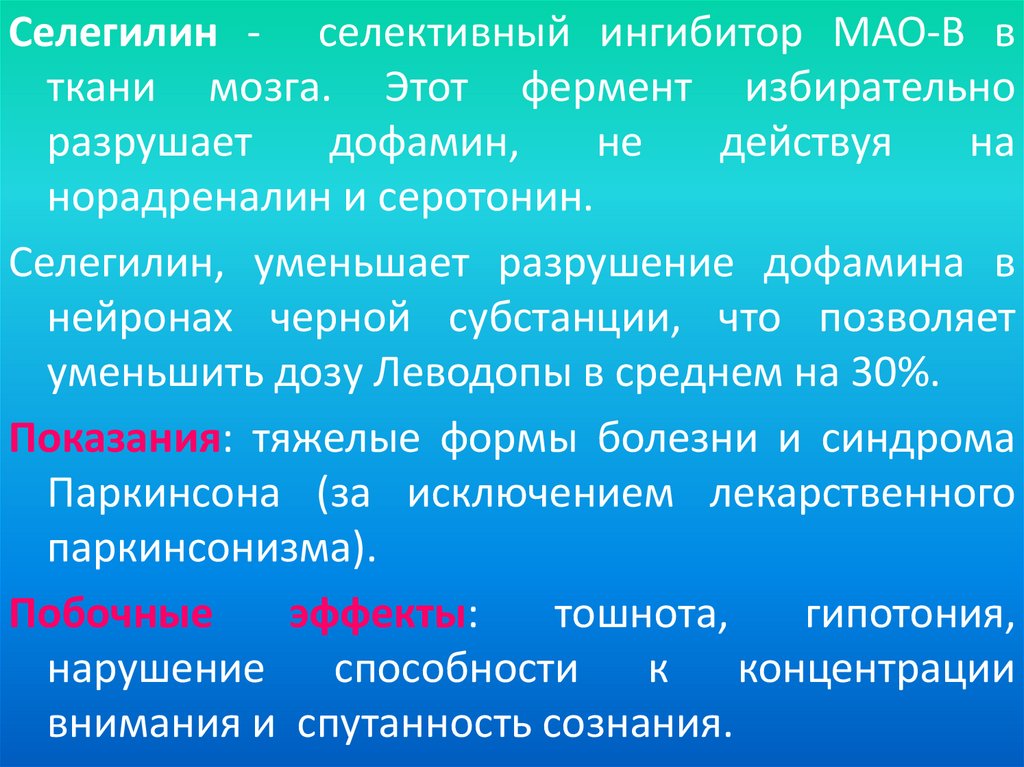 Селегилин - селективный ингибитор МАО-В вткани мозга. Этот фермент избирательно