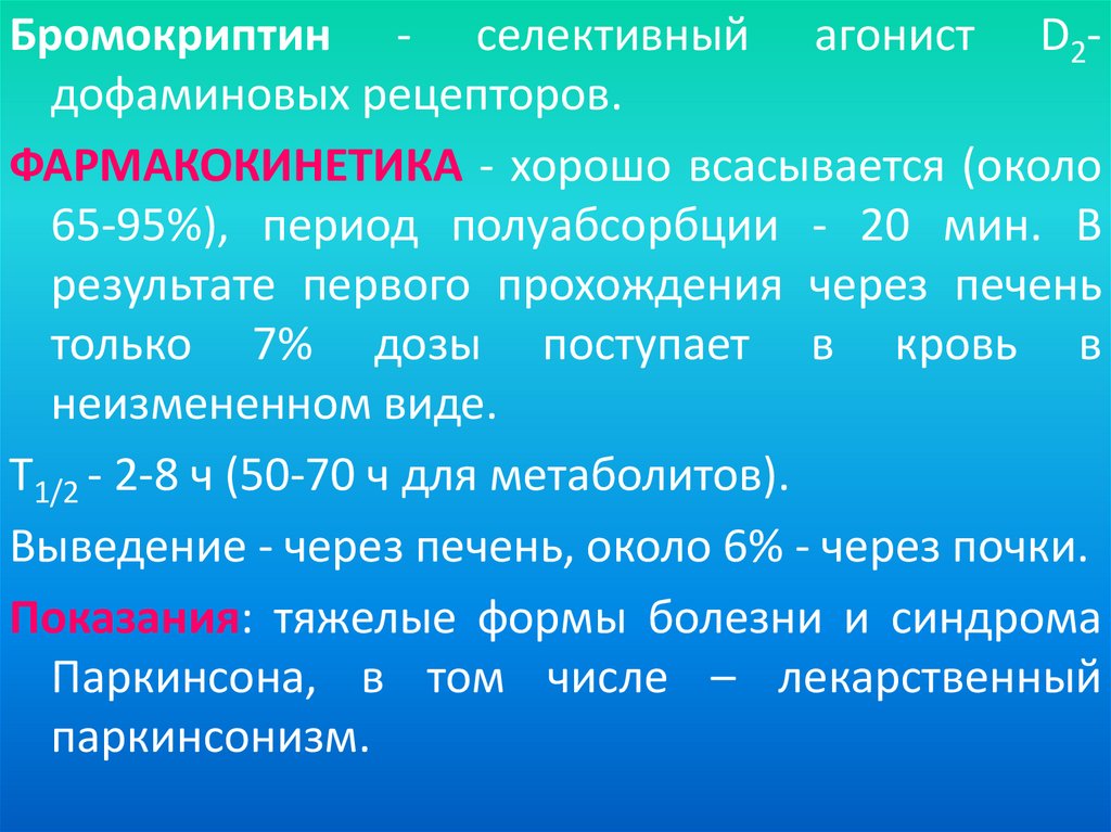 Бромокриптин - селективный агонист D2дофаминовых рецепторов.ФАРМАКОКИНЕТИКА - хорошо всасывается (около