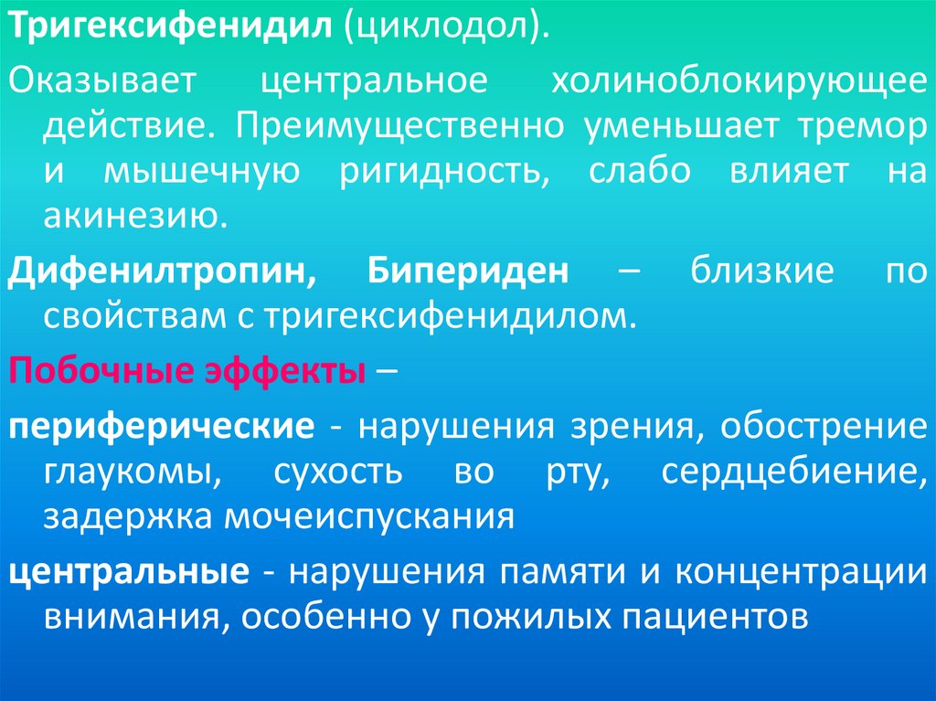 Тригексифенидил (циклодол).Оказывает центральное холиноблокирующее