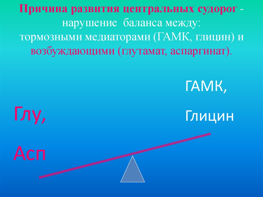 Причина развития центральных судорог нарушение баланса между:тормозными медиаторами (ГАМК, глицин) и