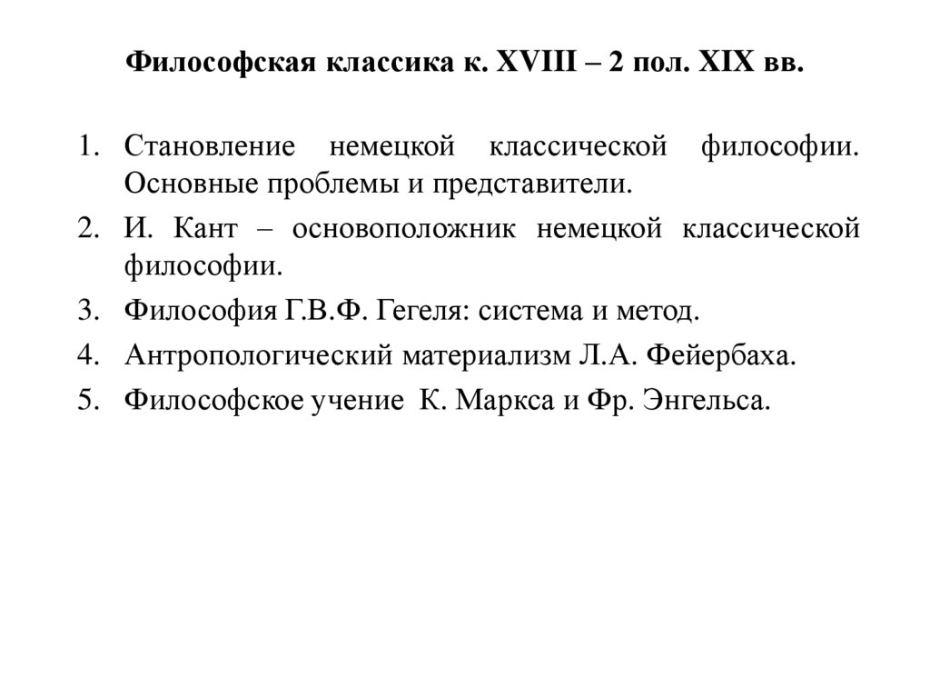 И. Кант, И.Г. Фихте, Ф.В.Й. Шеллинг, Г.В.Ф. Гегель, Л.А. Фейербах, К. Маркс,