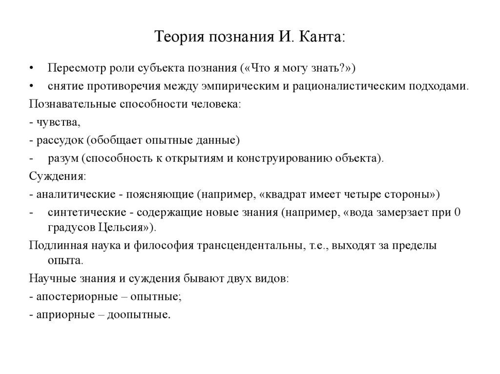 Теория познания И. Канта:• Пересмотр роли субъекта познания («Что я могу знать?»)