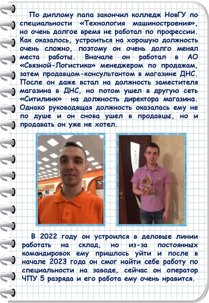 По диплому папа закончил колледж НовГУ поспециальности «Технология машиностроения»,