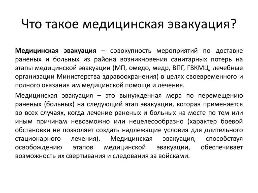 Что такое медицинская эвакуация?Медицинская эвакуация – совокупность мероприятий по доставке