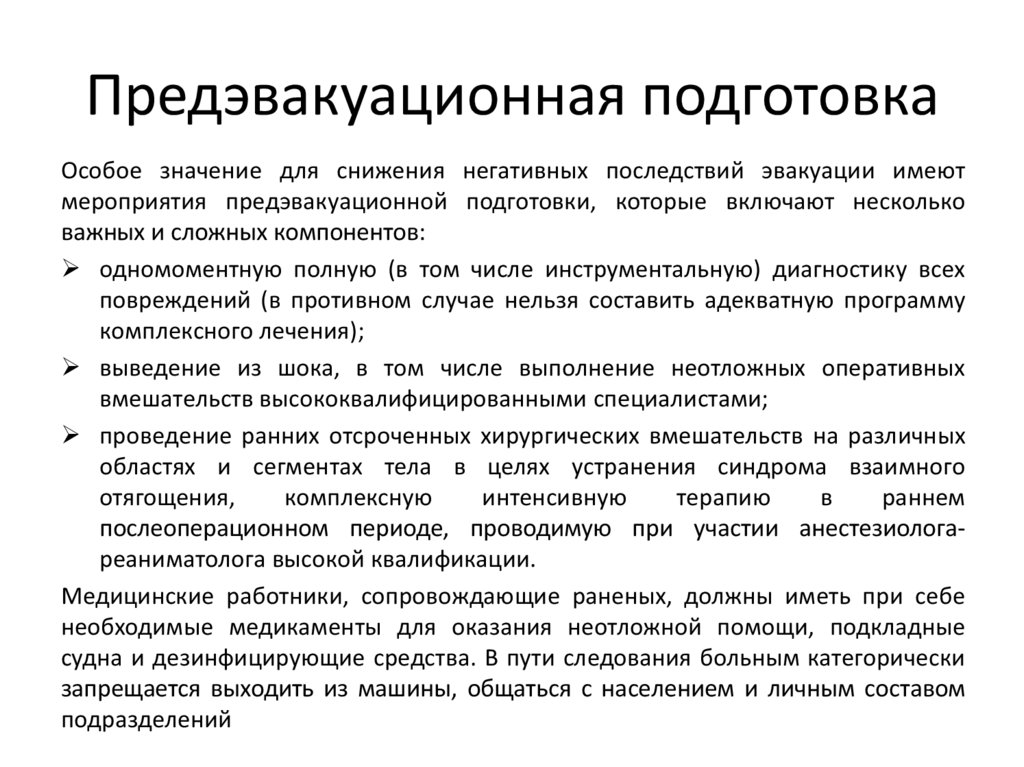 Предэвакуационная подготовкаОсобое значение для снижения негативных последствий эвакуации имеют