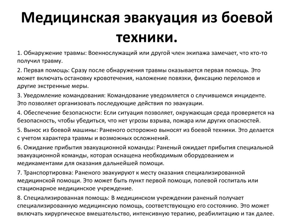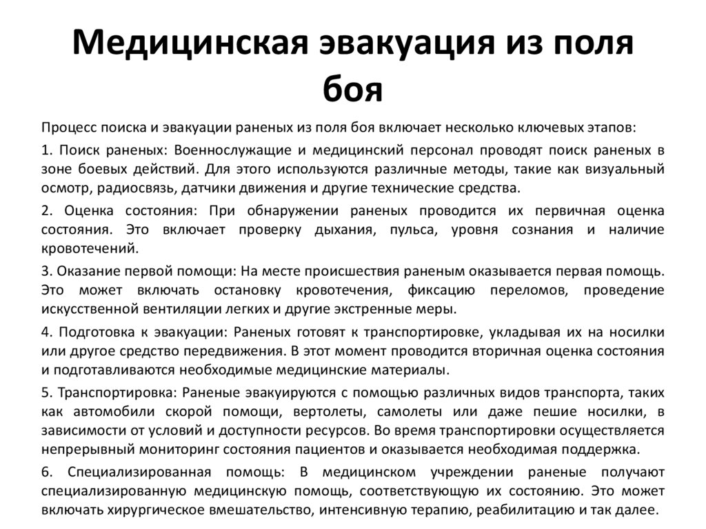 Процесс поиска и эвакуации раненых из поля боя включает несколько ключевых этапов: