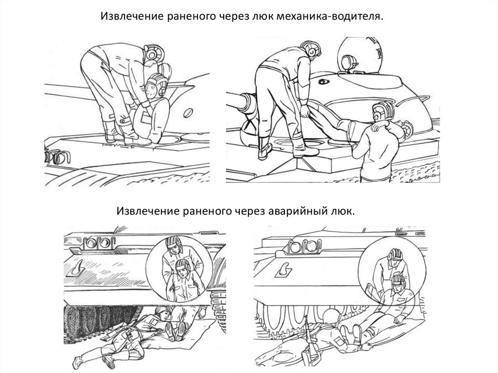 Извлечение раненого через люк механика-водителя.Извлечение раненого через аварийный люк.