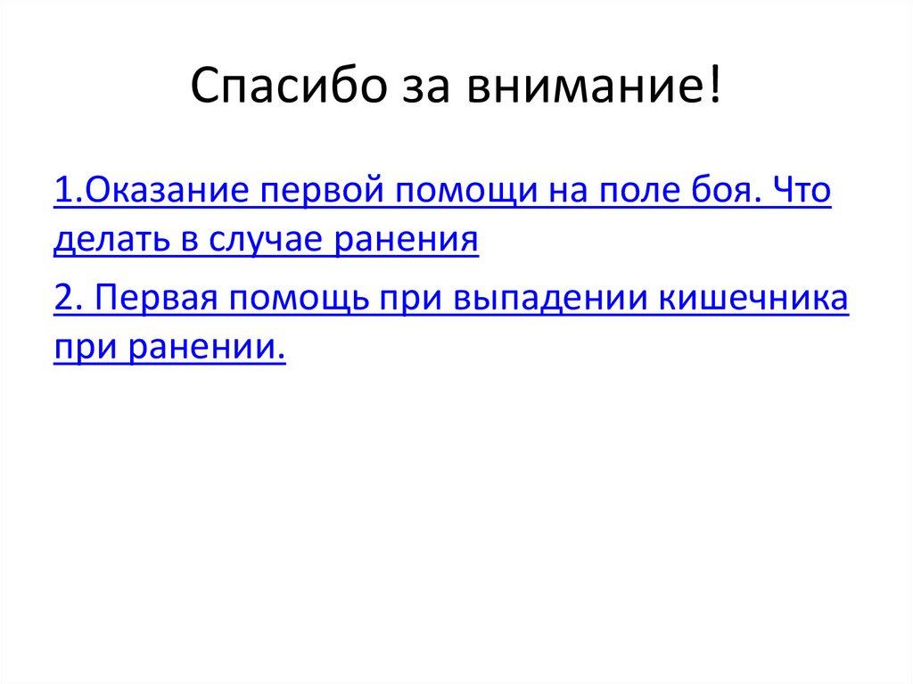 Спасибо за внимание!1.Оказание первой помощи на поле боя. Что