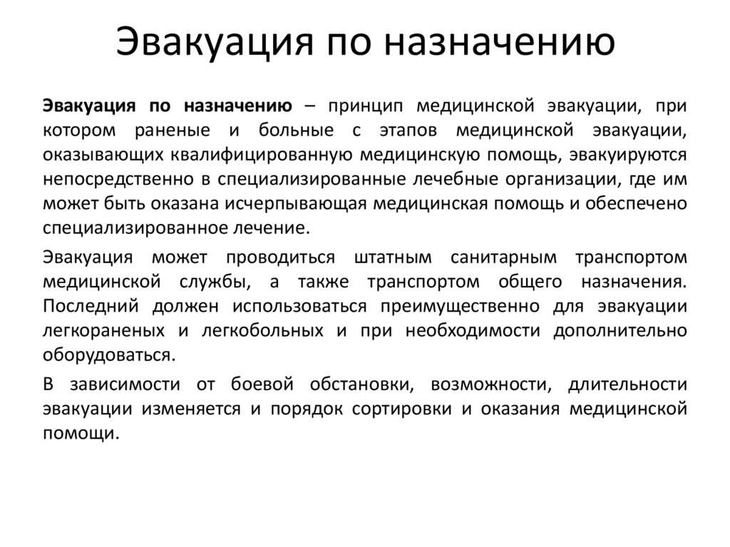 Эвакуация по назначениюЭвакуация по назначению – принцип медицинской эвакуации, при