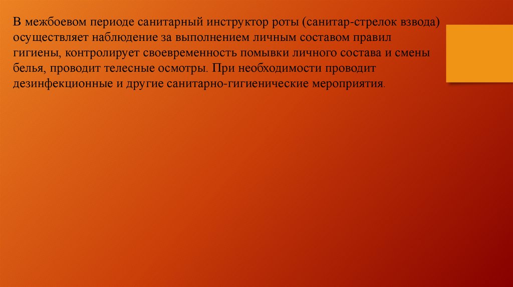 В межбоевом периоде санитарный инструктор роты (санитар-стрелок взвода)осуществляет наблюдение за выполнением личным составом правил