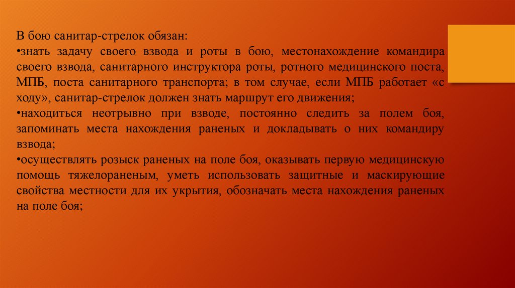 В бою санитар-стрелок обязан:•знать задачу своего взвода и роты в бою, местонахождение командира