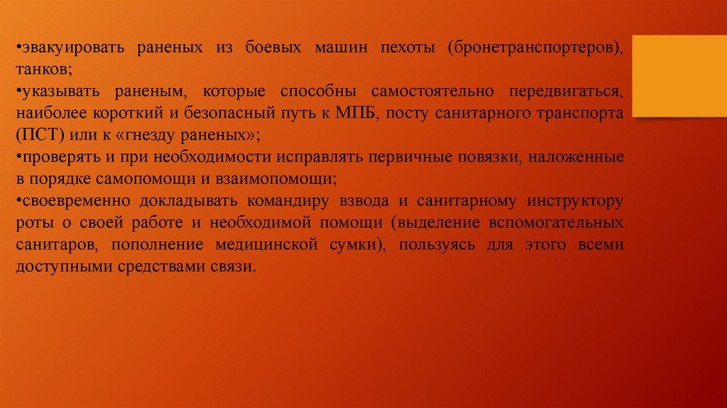 своего взвода, санитарного инструктора роты, ротного медицинского поста,