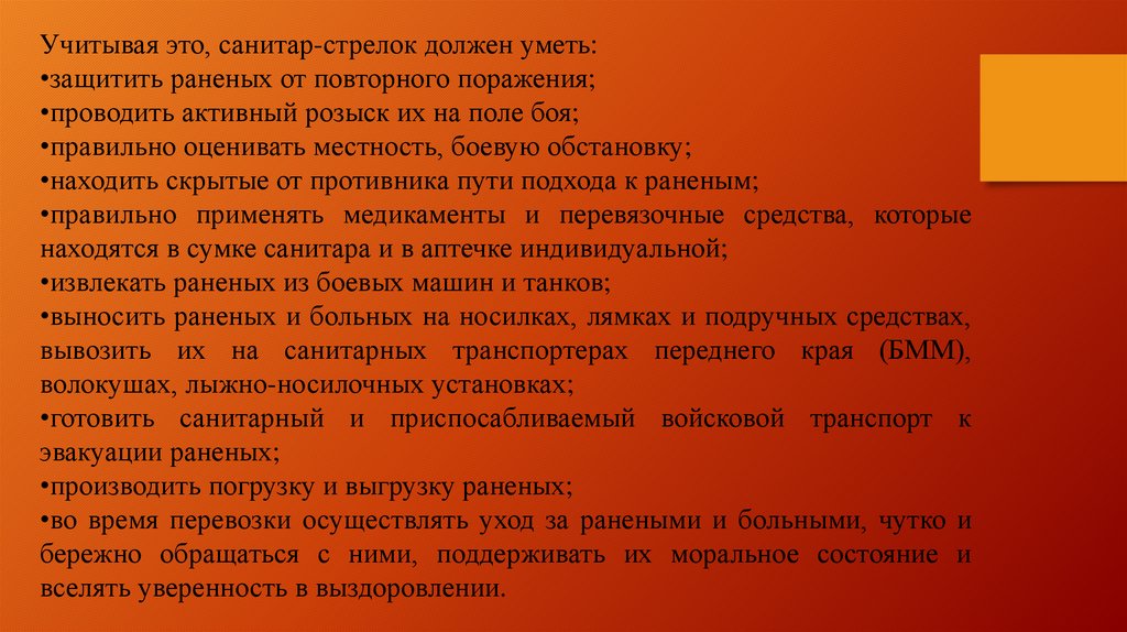 Учитывая это, санитар-стрелок должен уметь:•защитить раненых от повторного поражения;