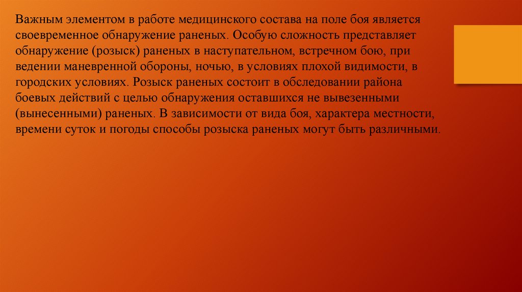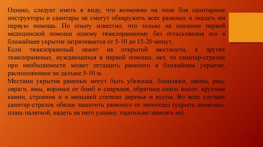 Однако, следует иметь в виду, что возможно на поле боя санитарныеинструкторы и санитары не смогут обнаружить всех раненых и оказать им