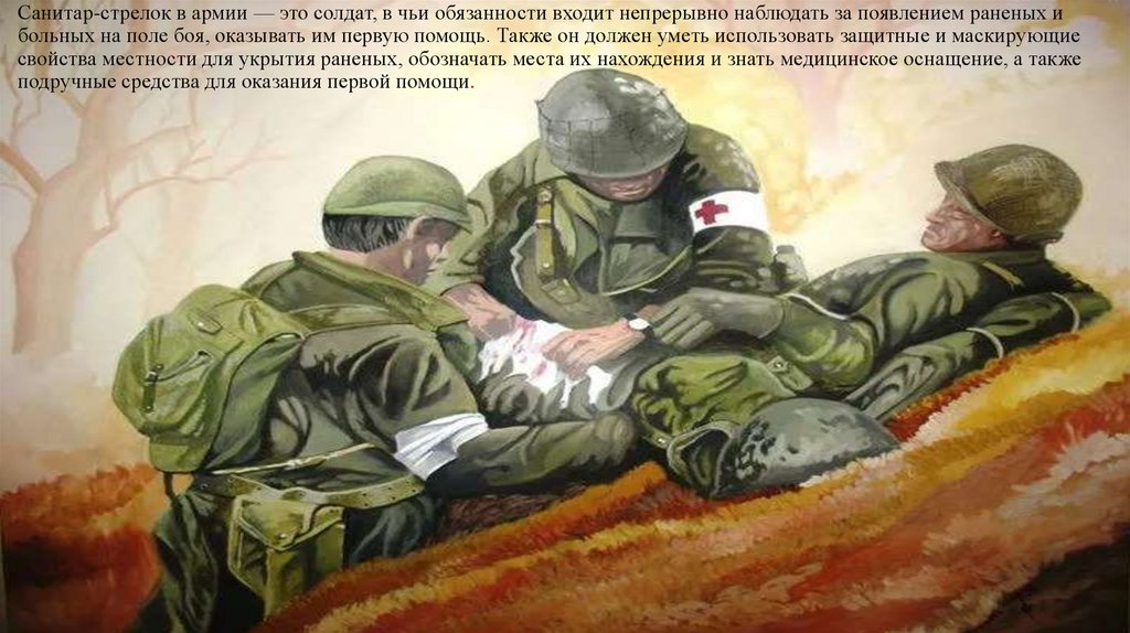 Санитар-стрелок в армии — это солдат, в чьи обязанности входит непрерывно наблюдать за появлением раненых ибольных на поле боя, оказывать им первую помощь. Также он должен уметь использовать защитные и маскирующие