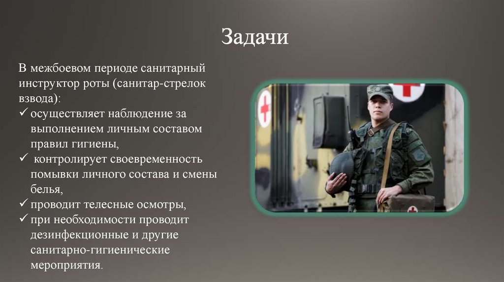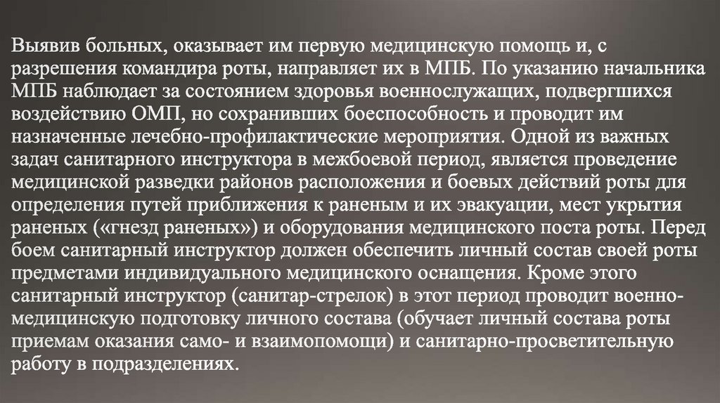 В межбоевом периоде санитарныйинструктор роты (санитар-стрелок