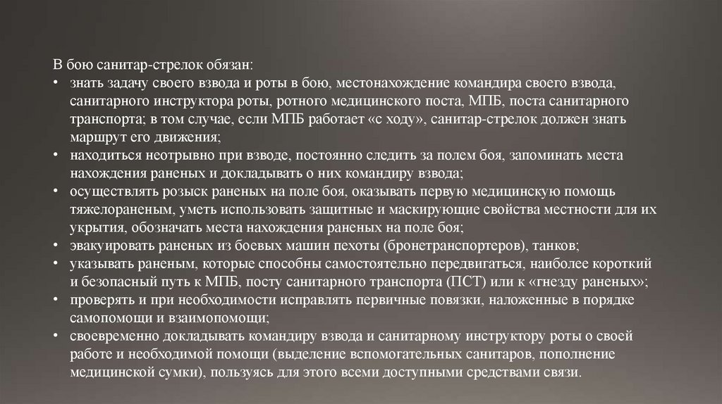 В бою санитар-стрелок обязан:• знать задачу своего взвода и роты в бою, местонахождение командира своего взвода,