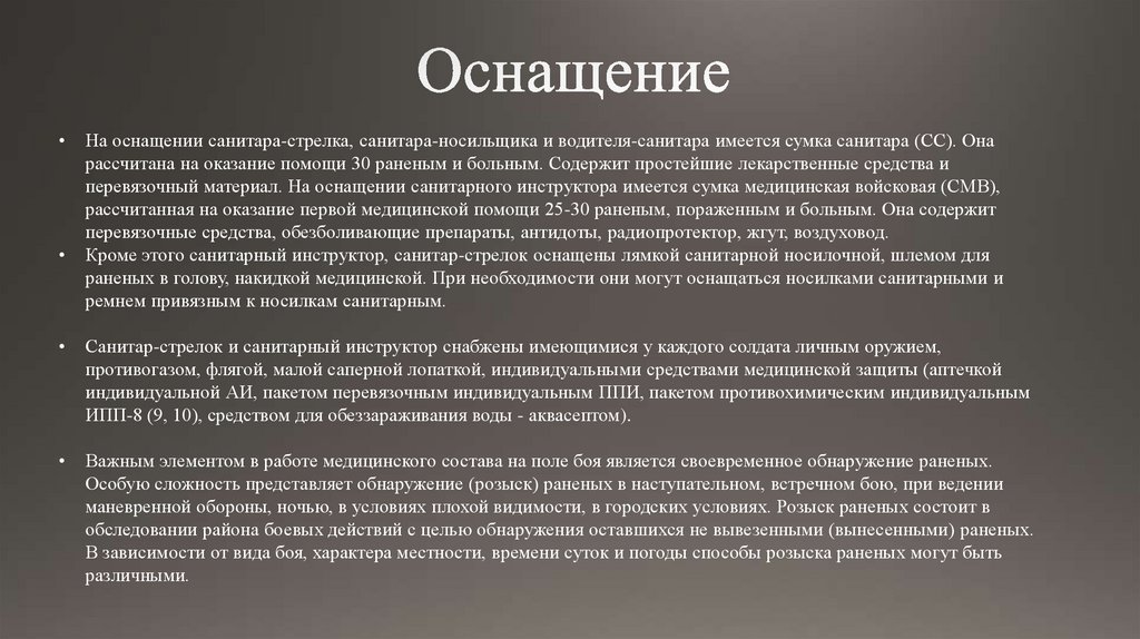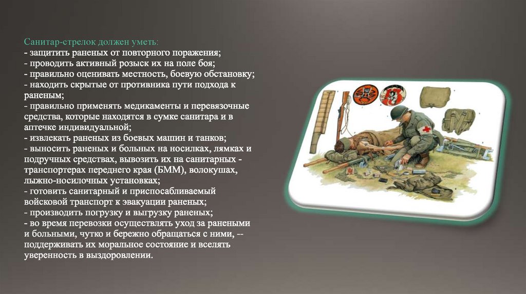 свойства местности для укрытия раненых, обозначать места их нахождения и знать медицинское оснащение, а также