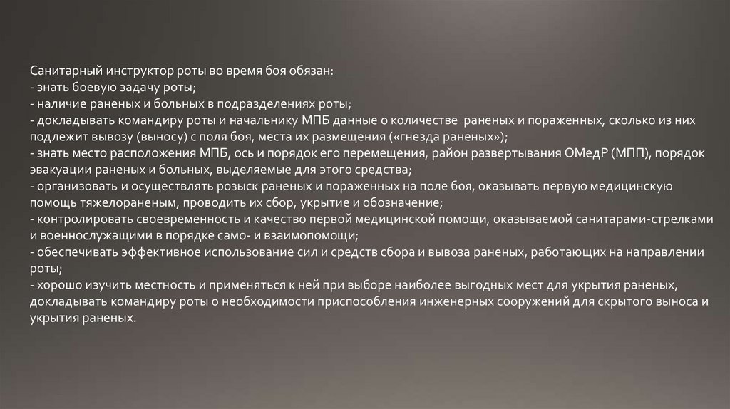 Санитарный инструктор роты во время боя обязан:- знать боевую задачу роты;
