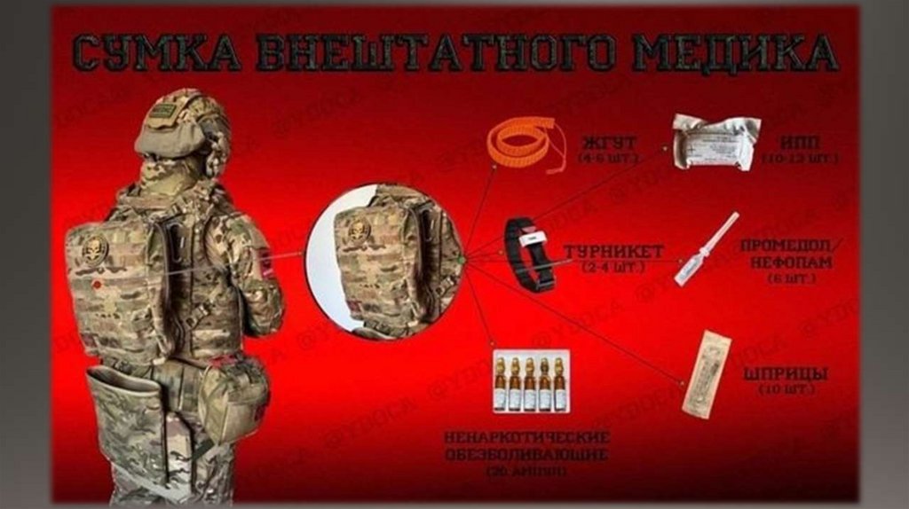На оснащении санитара-стрелка, санитара-носильщика и водителя-санитара имеется сумка санитара (СС). Она