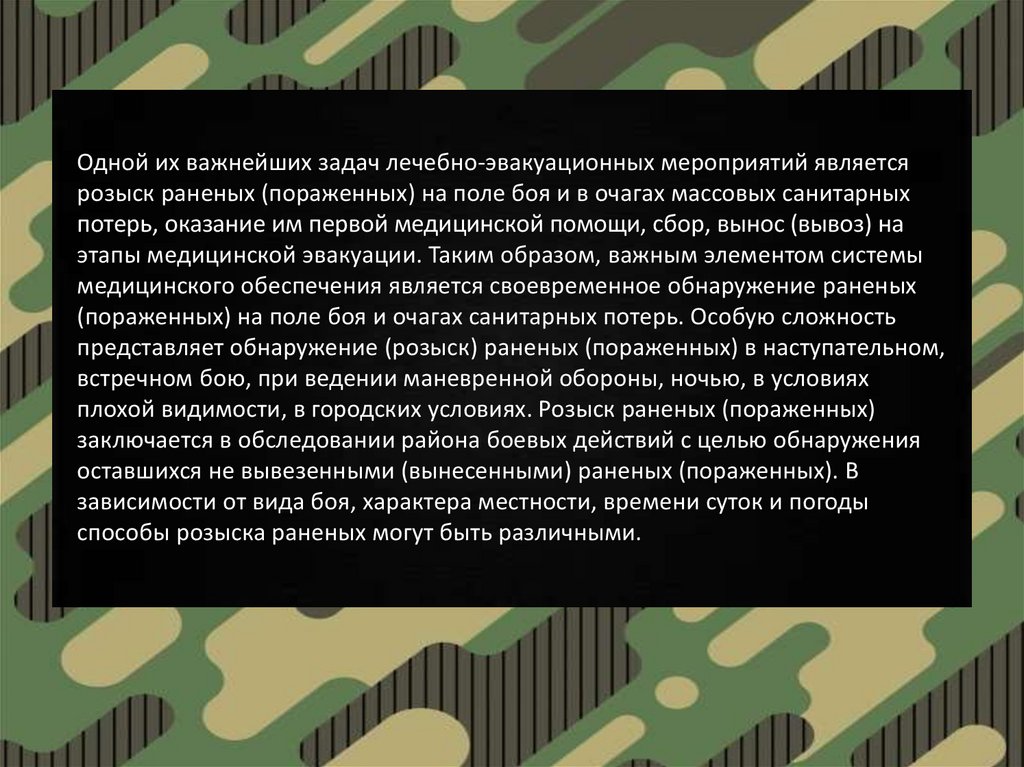 (пораженных) на поле боя и очагах санитарных потерь. Особую сложность