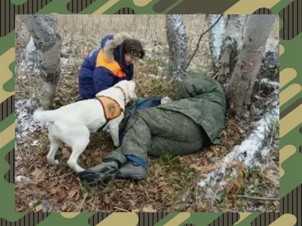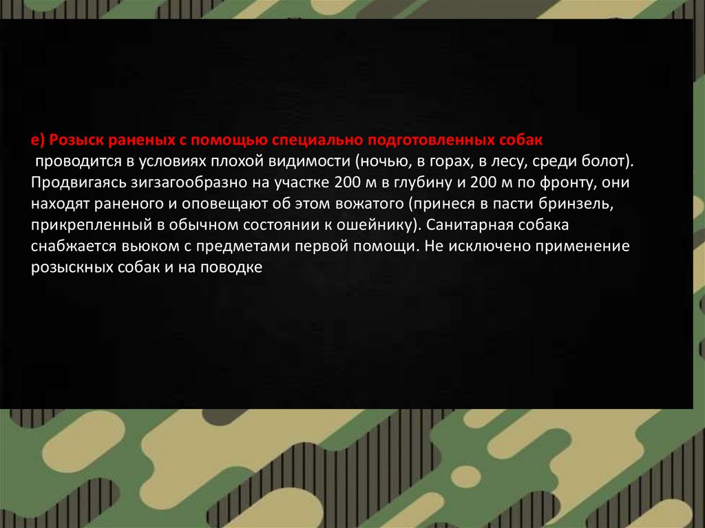 е) Розыск раненых с помощью специально подготовленных собакпроводится в условиях плохой видимости (ночью, в горах, в лесу, среди болот).