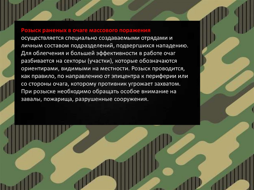 представляет обнаружение (розыск) раненых (пораженных) в наступательном,