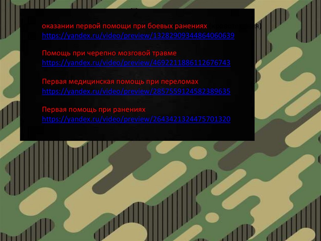 оказании первой помощи при боевых ранениях (кровотечения)https://yandex.ru/video/preview/13282909344864060639