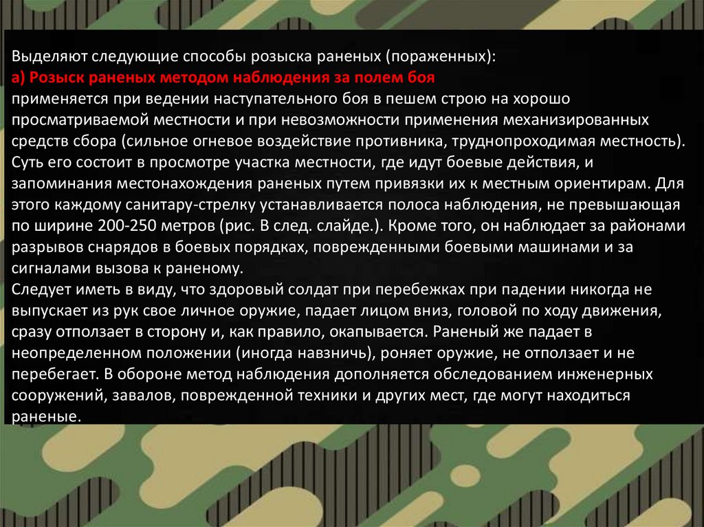 Выделяют следующие способы розыска раненых (пораженных):а) Розыск раненых методом наблюдения за полем боя