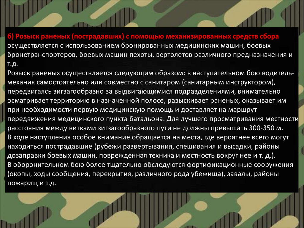 б) Розыск раненых (пострадавших) с помощью механизированных средств сбораосуществляется с использованием бронированных медицинских машин, боевых