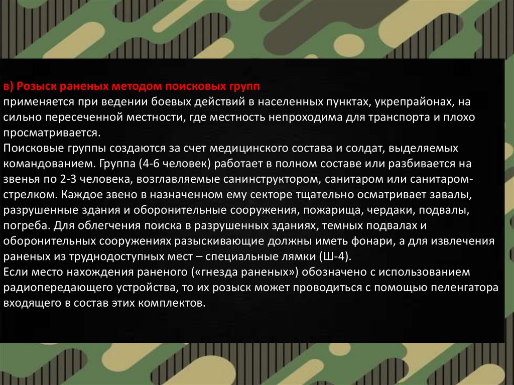 в) Розыск раненых методом поисковых группприменяется при ведении боевых действий в населенных пунктах, укрепрайонах, на