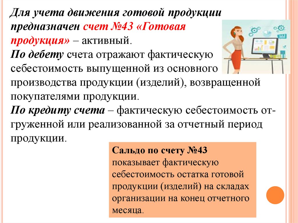 Для учета движения готовой продукциипредназначен счет №43 «Готовая