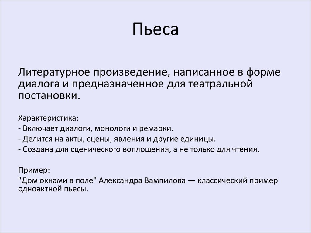 - Включает диалоги, монологи и ремарки.