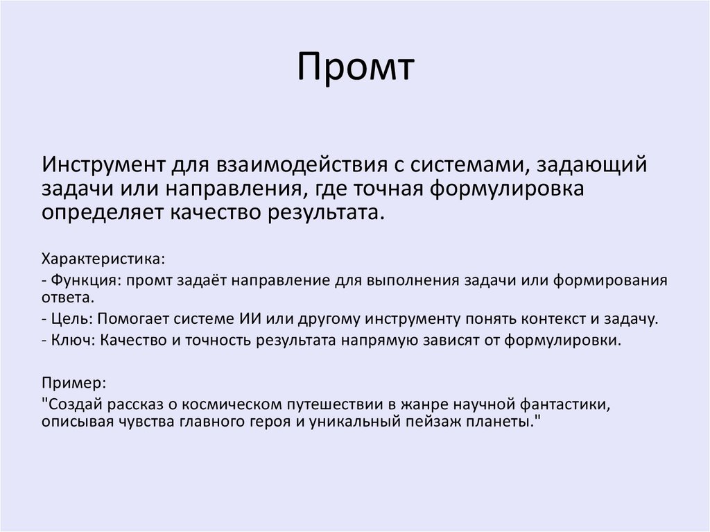 - Функция: промт задаёт направление для выполнения задачи или формирования