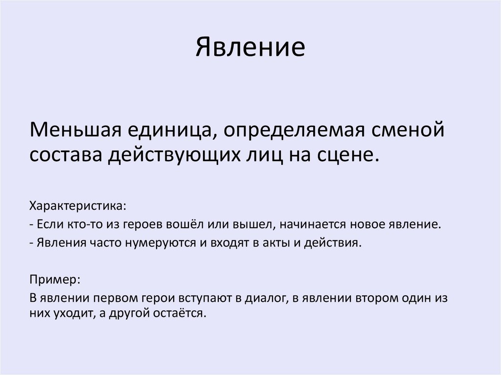 - Если кто-то из героев вошёл или вышел, начинается новое явление.