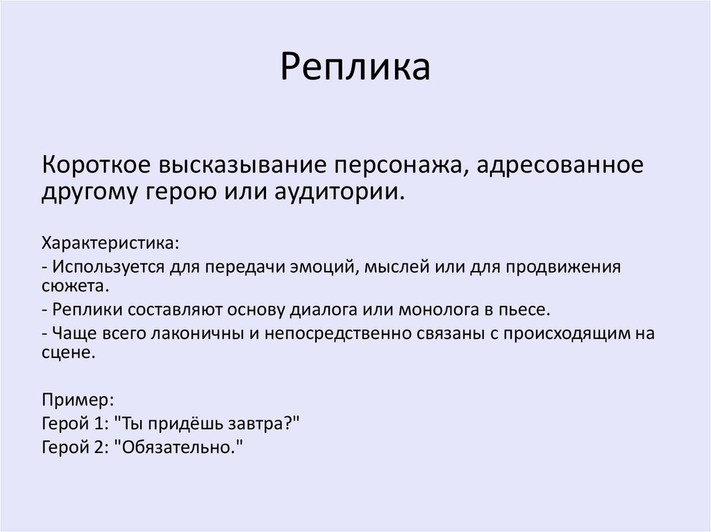 - Реплики составляют основу диалога или монолога в пьесе.