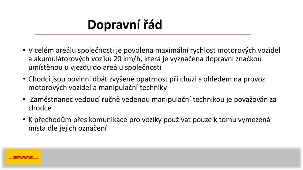 Dopravní řád• V celém areálu společnosti je povolena maximální rychlost motorových vozidel