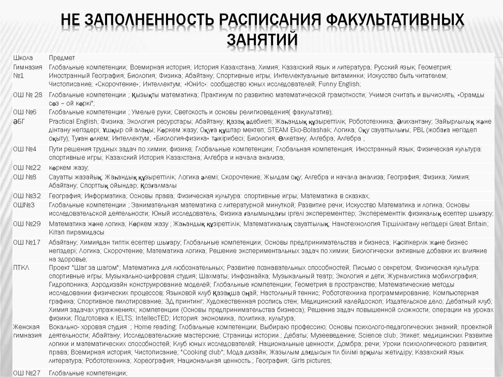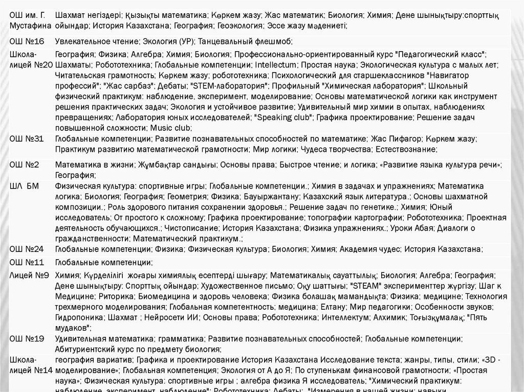 Глобальные компетенции; Физика; Физическая культура; Биология; Химия; Академия чудес; История Казахстана;