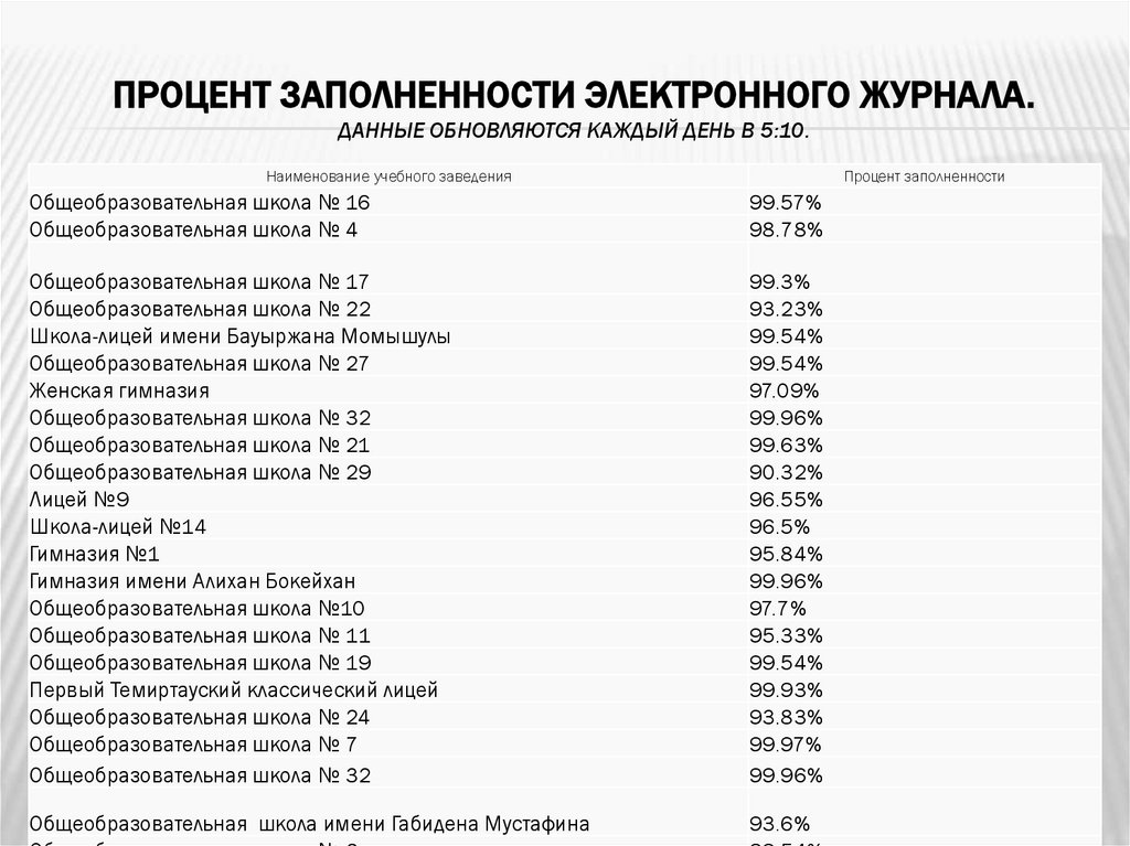 ПРОЦЕНТ ЗАПОЛНЕННОСТИ ЭЛЕКТРОННОГО ЖУРНАЛА.ДАННЫЕ ОБНОВЛЯЮТСЯ КАЖДЫЙ ДЕНЬ В 5:10.