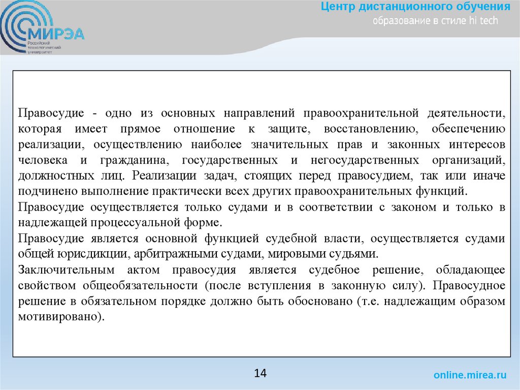 Центр дистанционного обученияПравосудие - одно из основных направлений правоохранительной деятельности,